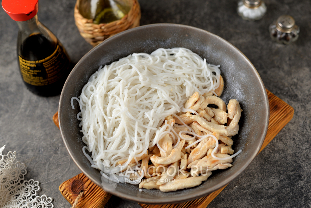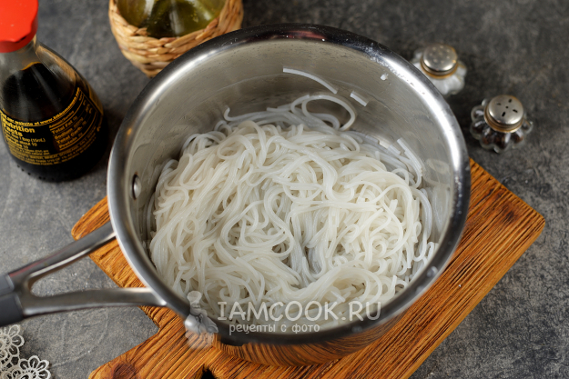 Отварите рисовую вермишель, как указано на упаковке - как правило, это 5-6 минут. Лапшу промойте холодной водой, чтобы она не склеивалась, откиньте на дуршлаг.