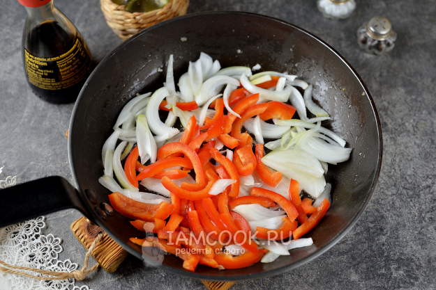 В это же масло положите нарезанный полукольцами лук и болгарский перец соломкой. Обжарьте овощи минуты 3 до мягкости.
