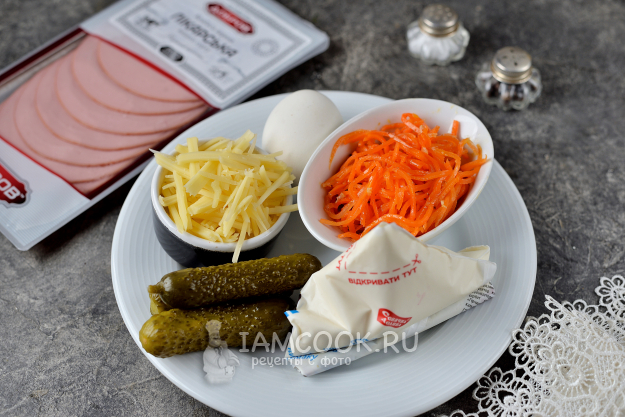 Для приготовления салата с вареной колбасой и корейской морковью нам понадобятся все продукты, что на фото. Огурцы должны быть маринованными и чуть сладковатыми, кислые и квашеные не добавляйте, лучше замените их на свежие. Яйцо отварите около 10 минут, остудите в холодной воде, почистите.