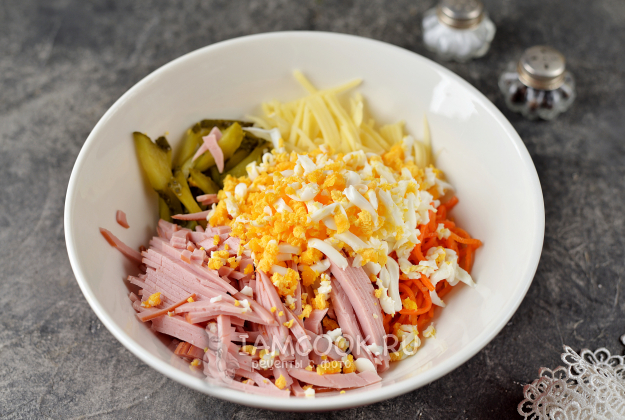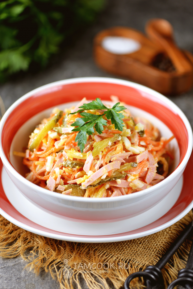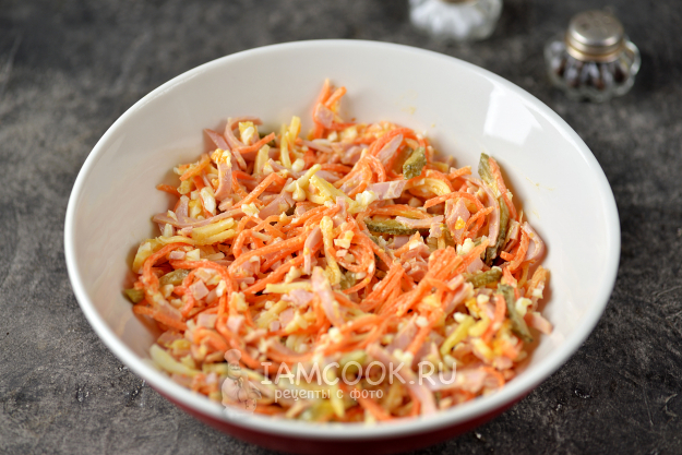 Салат с вареной колбасой и корейской морковью готов! Салат очень простой, сочный, достаточно калорийный и вкусный.