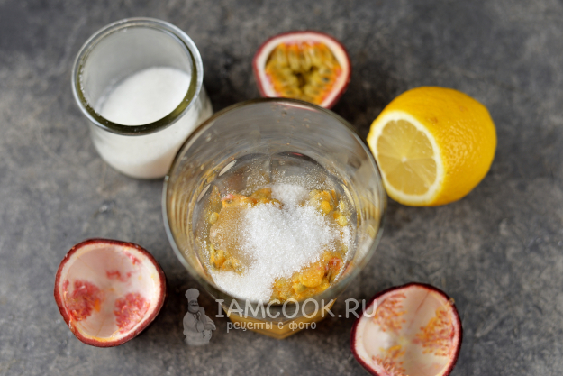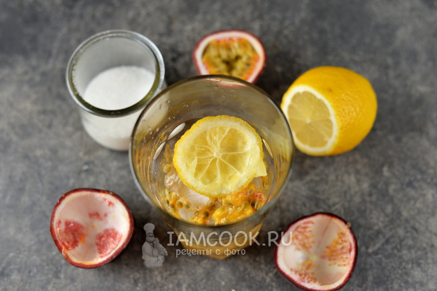 Влейте в стакан воду, интенсивно перемешайте коктейльной ложечкой с длинной ручкой. Можно дать лимонаду настояться какое-то время, чтобы маракуйя максимально отдала свой аромат напитку, только лед кладите прямо перед подачей в этом случае.