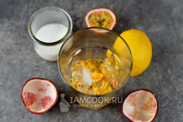 В большой стакан положите лед, разрежьте маракуйю пополам, выскоблите ложечкой сердцевину.
