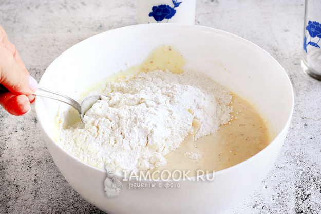 Влейте кефир и всыпьте муку с разрыхлителем и ванильным сахаром. Кефир старайтесь брать погуще и пожирнее. В наших краях продают очень густой кефир и я покупаю самый жирный, а в России, например, он слишком жидкий. Если кефир очень жидкий, то добавьте к нему пару ложек растительного масла, это сделает его если не гуще, то жирнее.