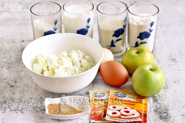 Чтобы приготовить манник с творогом и яблоками (на кефире) в духовке, возьмите всё необходимое по списку ингредиентов.