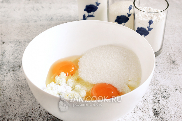 В емкости смешайте яйца, сахар, щепотку соли и творог. Пробейте все погружным блендером, чтобы масса получилась гладкой и без комочков. Если хотите, то просто смешайте все ложкой.