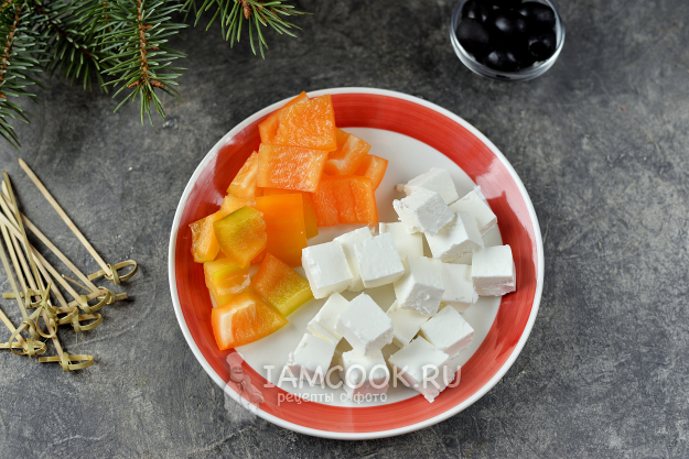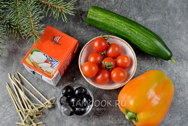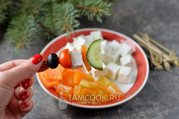 Формируется канапе, как показано на фото. Первым делом надевается маслина без косточки, потом помидор черри, кубик феты, болгарский перец, затем шпажку нужно воткнуть в огурец.