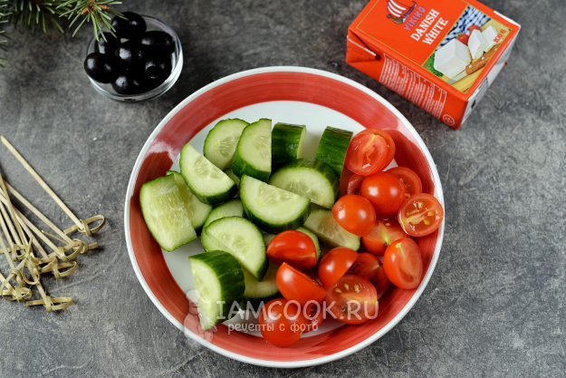 Подготовьте все продукты для канапе «Греческое» (ещё встречается название канапе «Греческий салат»). Овощи помойте и вытрите насухо бумажными полотенцами.
