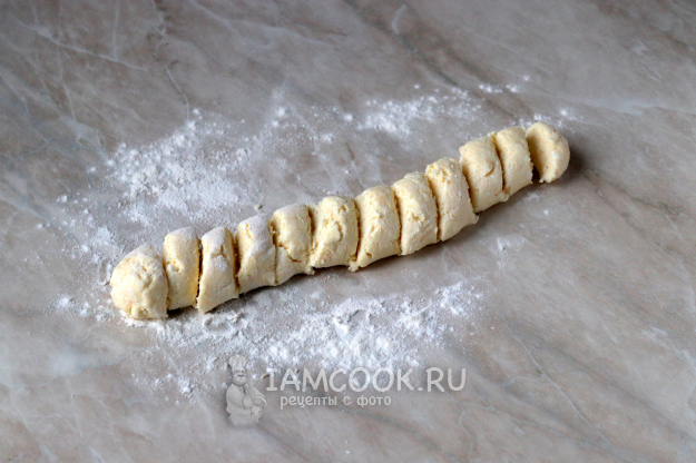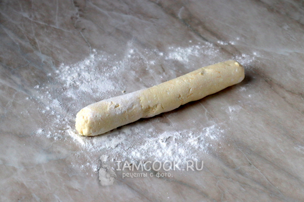 Разделим тесто на несколько частей, после чего каждую из них скатаем в колбаску (как на фото).