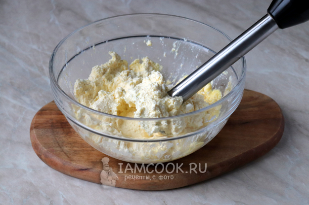 С помощью погружного блендера взобьем массу до однородного состояния или хорошо разомнём вилкой, чтобы не было слишком больших комочков.