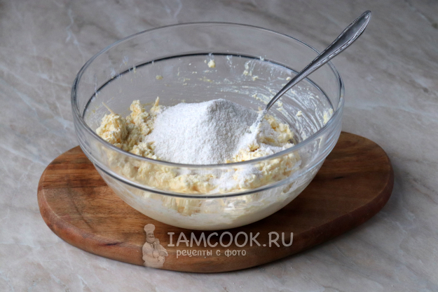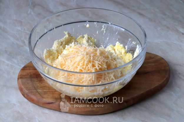 Добавим в творожную массу натёртый на средней тёрке сыр и хорошо перемешаем.