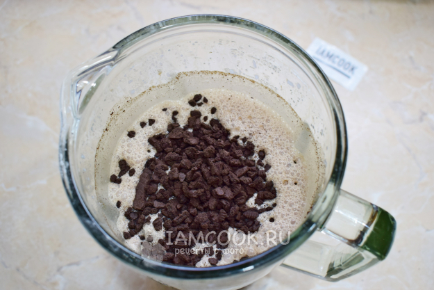 Затем вмешайте в коктейль крошку печенья. Вообще, по желанию, печенье можно и не добавлять. В коктейле печеньки становятся мягкими и приятно тают во рту. Нам это нравится.