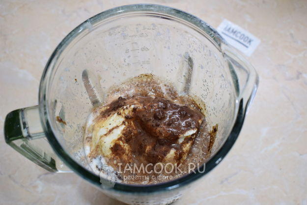 Следом перелейте шоколадную массу. Ничего страшного, что шоколад еще теплый. За счет добавленного мороженого коктейль будет холодным. Все ингредиенты взбейте до однородной массы.