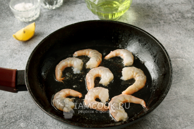 Очищенных креветок выложите в раскаленное масло на сковороду, пропарьте с двух сторон порядка минуты.