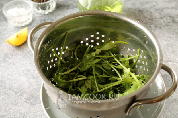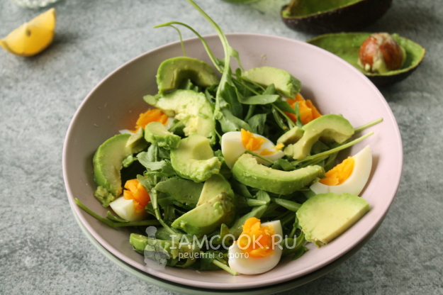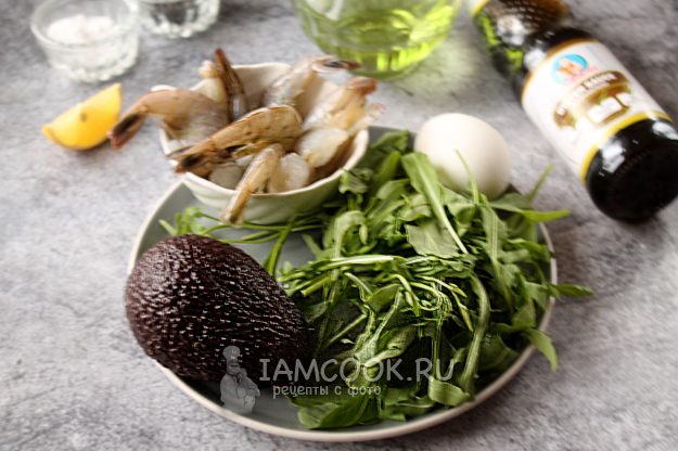Для приготовления салата с креветками, авокадо и рукколой возьмите продукты по списку. Заранее отварите яйцо вкрутую.