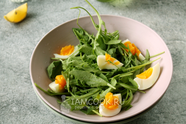 К зелени в тарелку добавьте дольками или кружками нарезанное вареное яйцо.