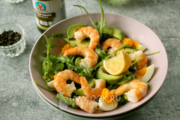 Прибавьте готовых креветок, приправьте перцем по желанию, соком свежего лимона и специфическим устричным соусом. Встряхните.