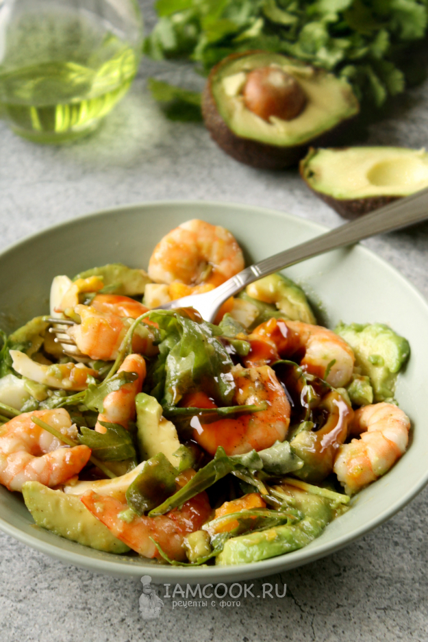 Подавайте салат с авокадо, креветками и рукколой без промедления.