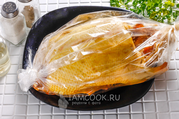 Спустя указанное время поместите утку в рукав для запекания. Разогрейте духовку до 200 градусов и выложите в форму с высокими бортиками. Если вдруг порвется пакет, то весь жир останется в форме, а не выплеснется на дно плиты!