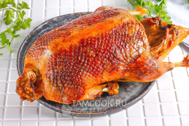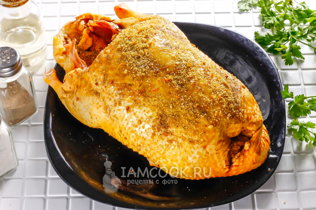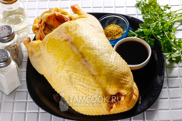 Подготовьте необходимые ингредиенты для запекания маринованной утки мулард в духовке для праздничного стола. Утку промойте в воде и обсушите, обязательно вырежьте железу на гузке.