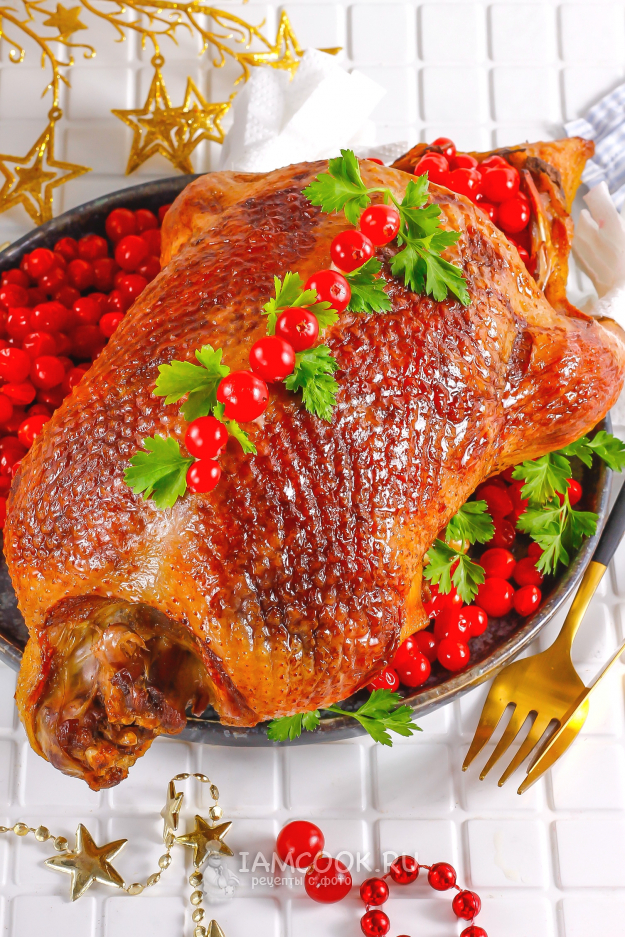 Запеките маринованную утку мулард в духовке согласно ее весу - например, эта утка весила 2,3 кг и я запекала ее примерно 2 часа с небольшим. В конце запекания рукав разрежьте и подрумяньте птицу. Если вдруг грудка утки быстро подрумянится, а внутри она останется непропеченной, то накройте ее фольгой или пергаментной бумагой и допеките.