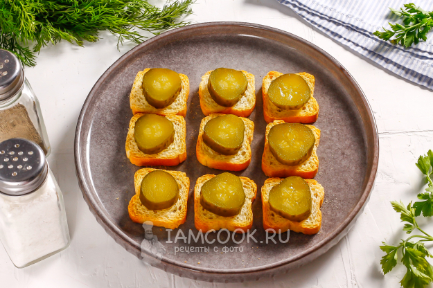 Нарежьте кружочками соленые огурцы и оставьте на 5 минут на досочке, чтобы стек выделившийся рассол. Затем выложите кружочки огурцов на сухарики.
