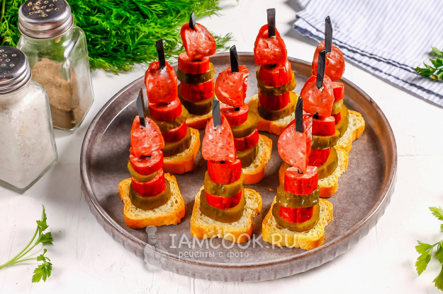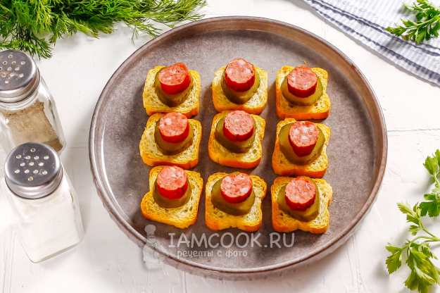 Оставшиеся колбаски нарежьте по диагонали ломтиками. Воткните шпажку в ломтик сверху и снизу, чтобы у вас получился небольшой парус. Затем проткните шпажкой башенку и сухарик. Таким образом соберите и остальные канапешки.