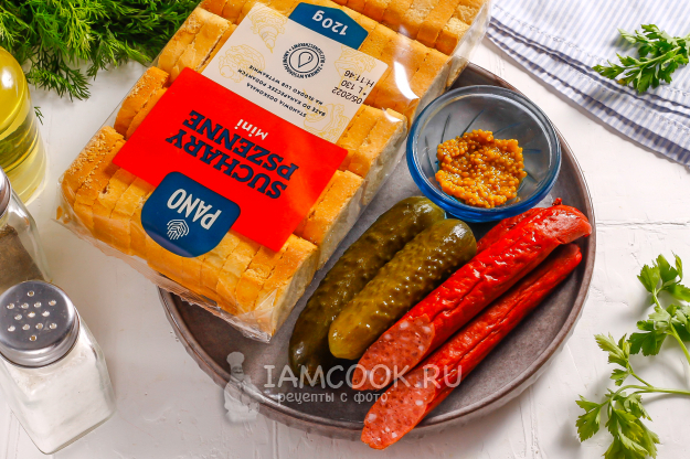 Возьмите необходимые ингредиенты для создания канапе с охотничьими колбасками на шпажках.