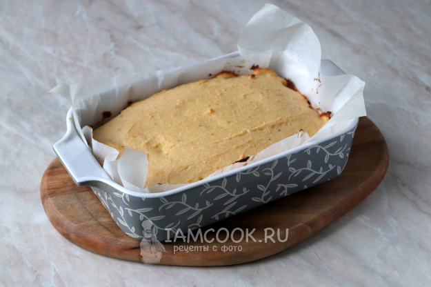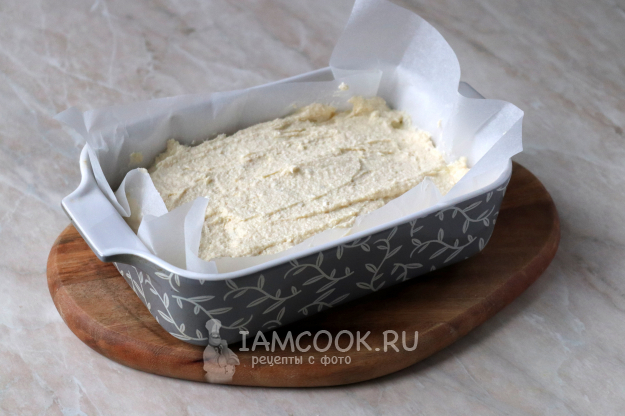 Переложим его в жаропрочную форму, застеленную пергаментом. Поверхность разровняем ложкой или силиконовой лопаткой.