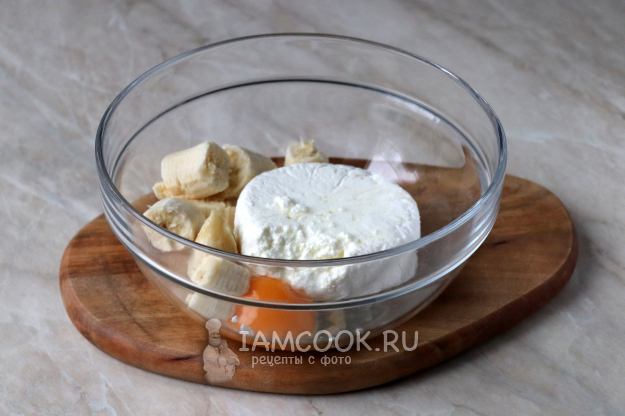 В глубокой миске соединим творог, куриное яйцо и мякоть банана.