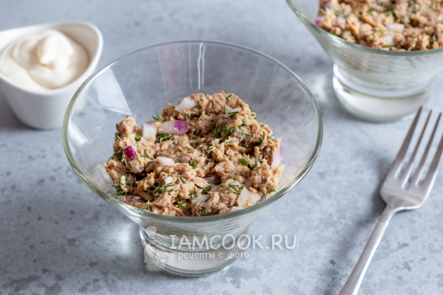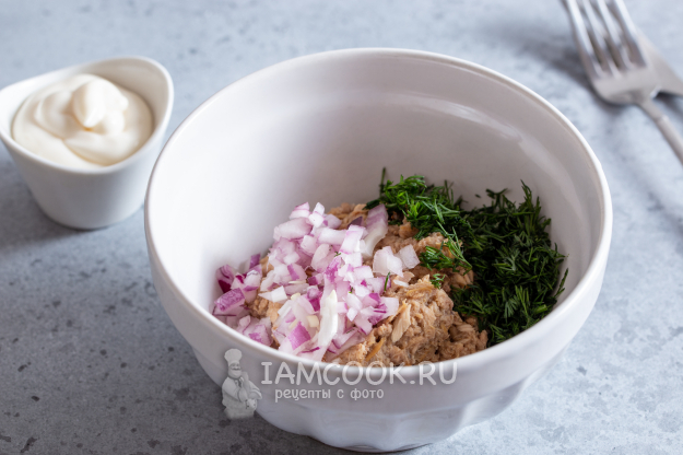 С тунца слейте лишнюю жидкость. Выложите в глубокую миску и разомните вилкой. Добавьте очищенный порезанный лук и зелень укропа. Перемешайте, при необходимости добавьте немного соли.