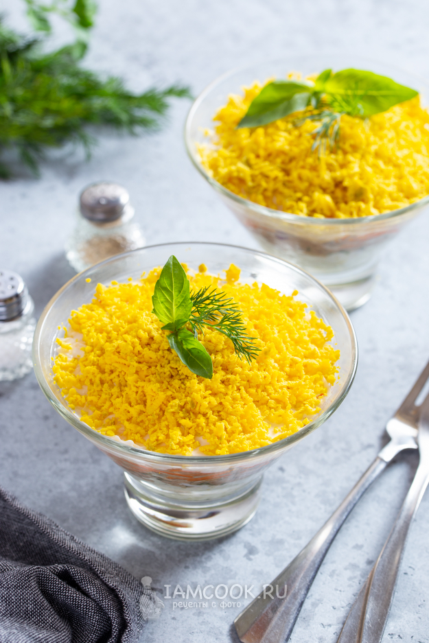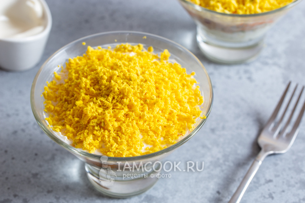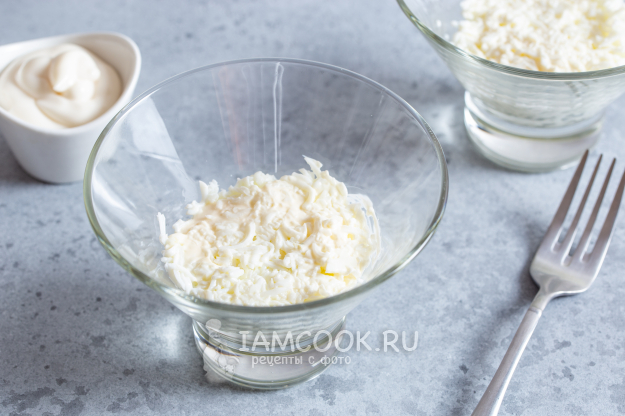 Яйца очистите и разделите на белки и желтки. Белки натрите на средней тёрке, смешайте с небольшим количеством майонеза и выложите на дно выбранной посуды для салата.