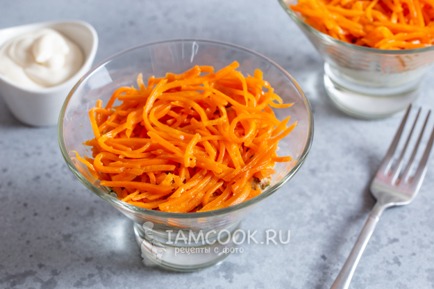 Следующий слой - морковь по-корейски. Если она очень длинная, то её лучше немного порезать. Промажьте и этот слой майонезом.