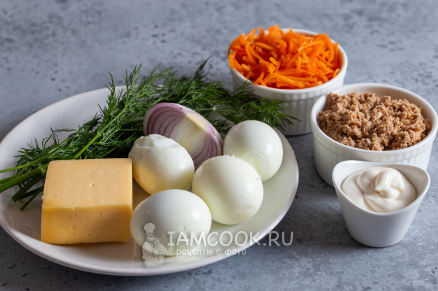 Подготовьте указанные ингредиенты для салата с консервированным тунцом и корейской морковью. Яйца предварительно отварите и охладите. Лук я беру салатный, можно взять и репчатый, зелёный перьями. Подготовьте посуду для салата - это может быть как порционная подача, так и в большом салатнике.