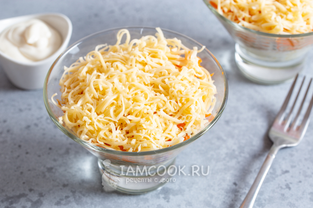 Выбранный твёрдый сыр натрите на средней тёрке и выложите следующим слоем в салат, промазав майонезом.