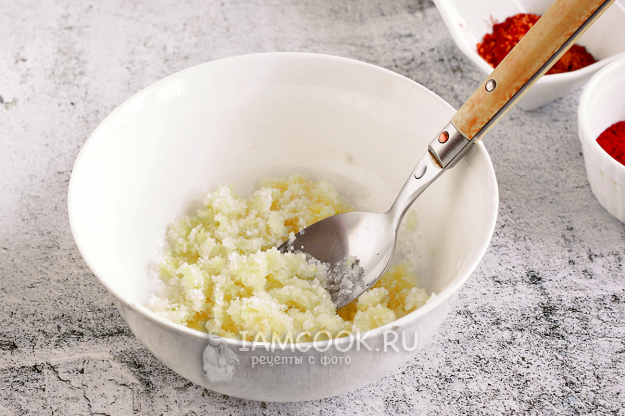 Добавьте соль и сахар, хорошенько перетрите ложкой.