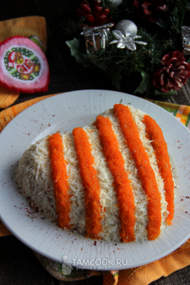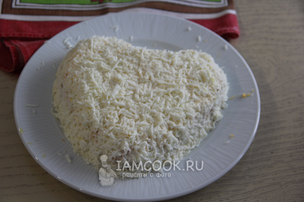Яичные белки натереть на мелкой терке и покрыть ими всю поверхность салата.