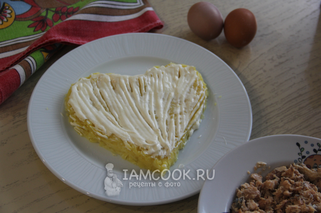 Картошку почистить и натереть на терке. Выложить на плоскую тарелку и сформировать форму сердца. Посолить слой картофеля и слегка утрамбовать.