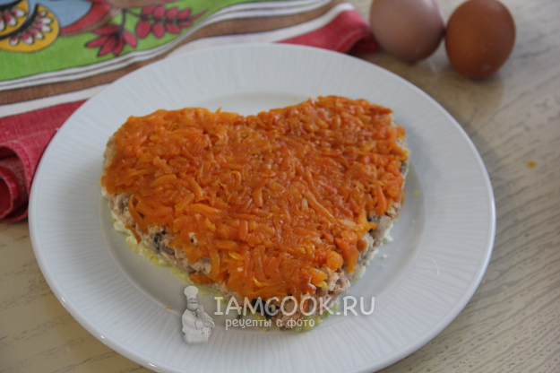Затем одну морковь почистить и натереть на тёрке. Выложить тертую морковь поверх горбуши и слегка утрамбовать вилкой.