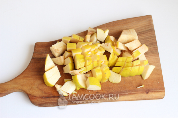 Айву помоем, удалим семенную коробочку с семенами, срежем все механические повреждения. Затем нарезаем на кубики.