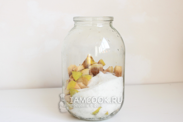 Настаиваю ликер в банке, но можно подобрать любую удобную тару. В банку выкладываем айву, засыпаем сахаром. Количество сахара можно регулировать по своему усмотрению.