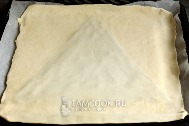Половину слоеного теста тонко раскатайте (2 мм) по размеру вашего противня. Перенесите тесто на противень с помощью скалки и выложите его на просиликоненный пергамент, к которому ничего не прилипает. Размер моего противня по внутреннему краю - 34x30 см, а сам противень гораздо больше - 45x39 см.