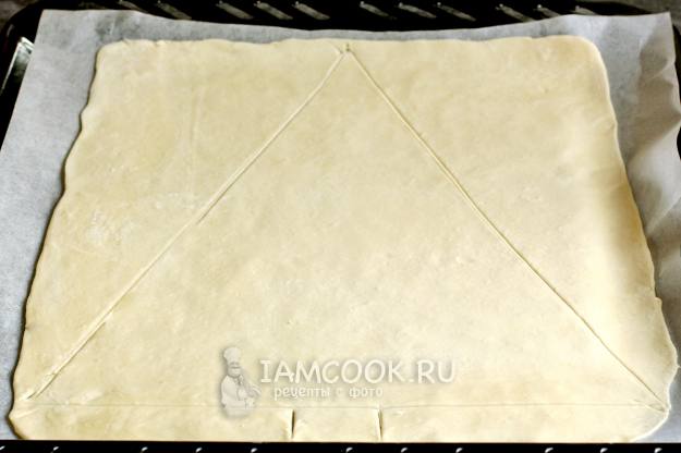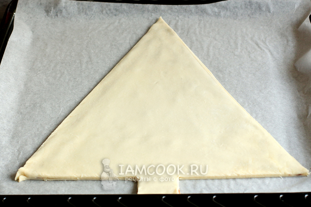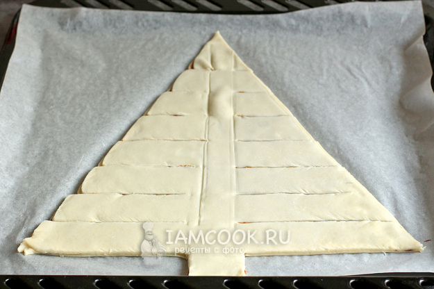 Срежьте лишнее тесто четко по краю будущей елочки. Из него можно будет приготовить рогалики или другие слоеные изделия.