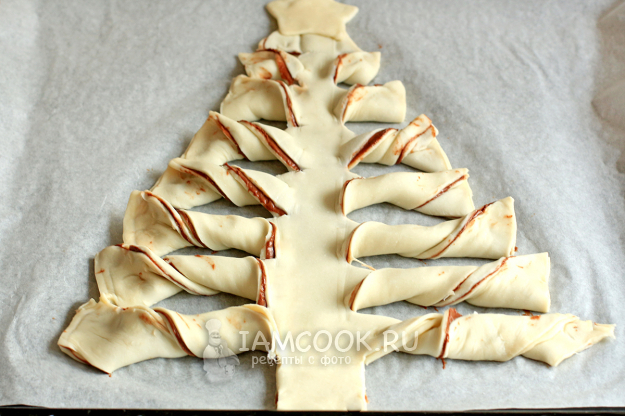 На вершину водрузите звезду из этого же теста. Аккуратно заверните полоски теста в одном направлении, сделав три оборота вокруг своей оси.