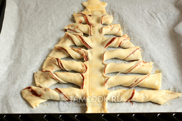 Смажьте елочку взбитым яйцом и отправьте в разогретую до 180 градусов духовку на 15 минут. Регулируйте процесс по своей духовке. Нужно чтобы елочка зарумянилась.