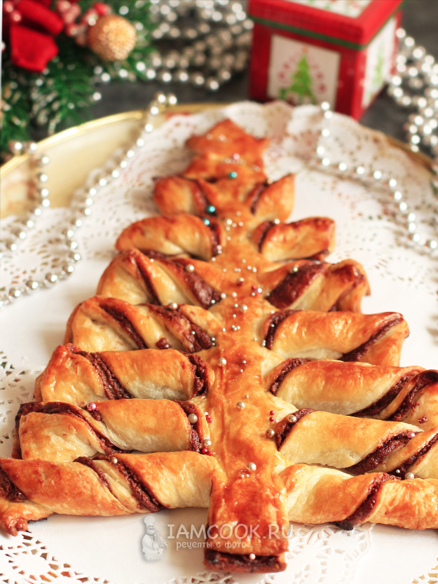 Готовую новогоднюю елку из слоеного теста украсьте по своему желанию - бусинками, шоколадом или сахарной пудрой.