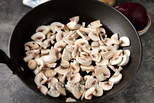 Свеклу также нарежьте мелким кубиком, переложите в миску вместе с обжаренными и остывшими грибами.