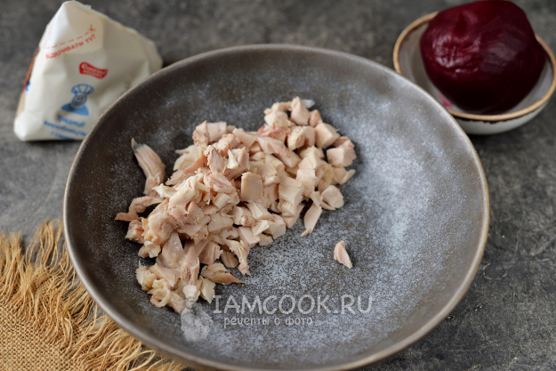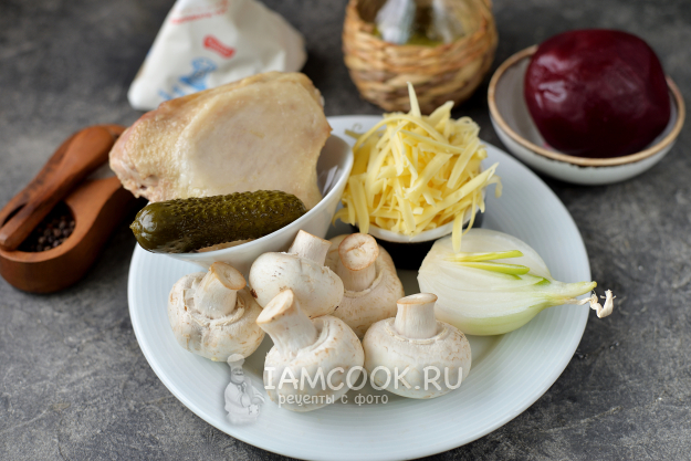 Возьмите все необходимые продукты для салата с курицей, грибами и свеклой. Курицу и свеклу отварите и остудите заранее, свеклу очистите от кожуры.