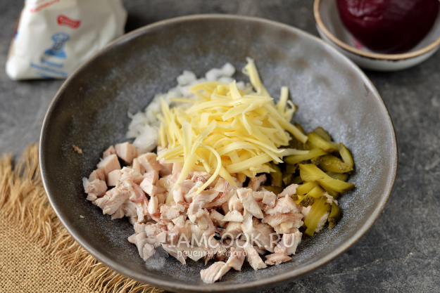 Огурец я взяла кислый бочковой. Если будете использовать маринованные, тогда можно положить их немного больше. Нарежьте огурец мелкой соломкой, сладкий лук нарежьте меленьким кубиком, натрите твердый сыр. Вместо белого лука можно положить зеленый. Добавьте все эти ингредиенты в миску к курице.