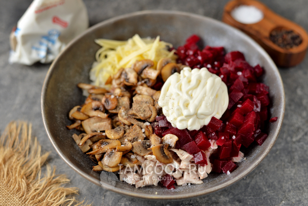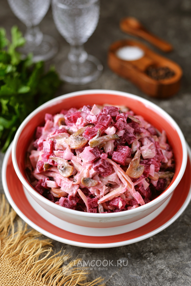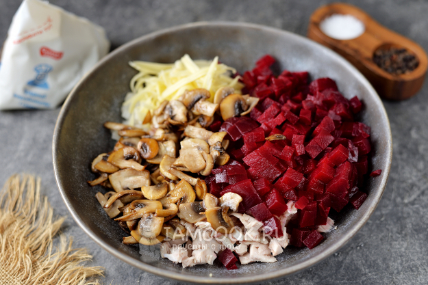Вкусный, сытный салат с курицей, грибами и свеклой готов! Разложите по порциям и сразу же подавайте к столу.
