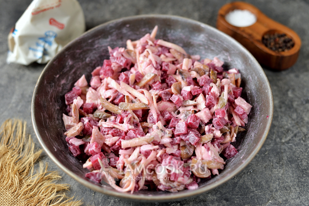 Добавьте майонез любимого производителя, соль и перец по вкусу.